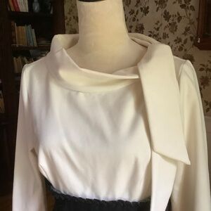 This dress is in great condition. The top is off white jersey fabric. The bottom is lightweight cord fabric. No belt available. Side zip closure. The tag says size 8 but it runs small. Please check the measurements. Shoulders 15.5 in, bust 36 in, hips 39in, length 38 in. 3/4 sleeve. Comes from pet free, smoke free home.