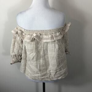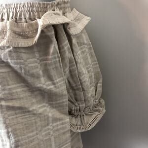 Steve May off shoulder Willow top in sand gingham. 55% linen, 45% cotton. Elastic tie detail, cinched cuffs. Made from soft, lightweight material.