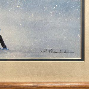 Color offset winter Amish skaters scene lithograph by artist Steve Polomchak. Signed wall art!