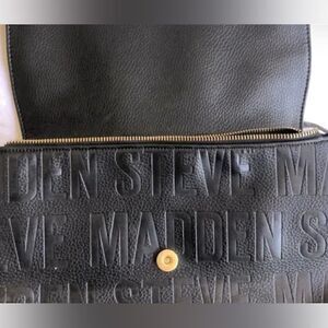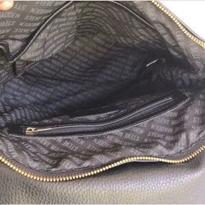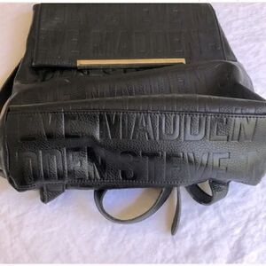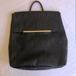 Great condition Steve Madden Backpack style purse. Slight wear on edges of straps and gold bar as shown in pictures otherwise looks great! Clean inside. Interior has a side zipper pocket and two side open pockets. Zipper and magnetic clasp closures. Approximate measurements: 14” wide 13” high 3.5” deep