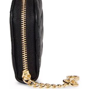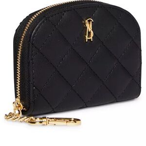 Elegant black quilted leather coin purse with gold-tone accents. Perfect for organizing your essentials in style.