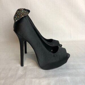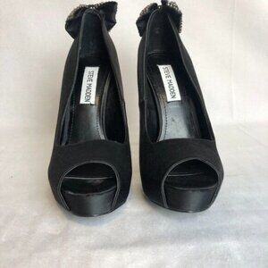 Steve Madden Black Stiletto Peep Toe Heel w/Bow 8M - "Shimma", 4 inch heels. Fabric bow with rhinestones on the back of the heel. Shiny fabric show with Silver bottoms. New without box, storage wear but never worn.