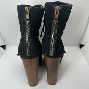Suede upper with buckled strap detail at vamp Back-zip closure with lace-up front Hidden platform with wood-finished heel - minor scuffs/minor marks and suede.