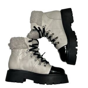 Steve Madden Color block Bone/Black Leather Lace Up Boots, Faux Fur Lining, Stock Photo For Reference only.