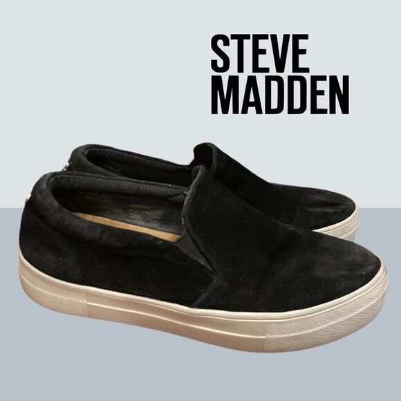 Cute pair of Steve Madden women's "Gills" black, suede, leather, platform sneakers.