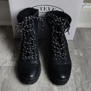 Awesome pre-loved Steve Madden black booties with a faux Sherpa trim, fun laces and side zipper. Excellent condition...minor dirt on soles. Perfect everyday comfort and style. Size 8. Retail $95