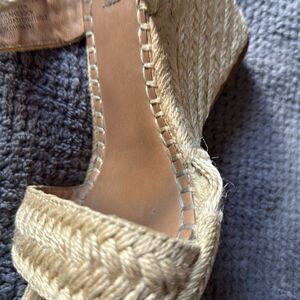 Good used condition – includes a visible separation where the footbed meets the side raffia banding on the inner edge of the left sandal (see close-up photo). Still wearable. Price reflects this flaw.