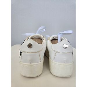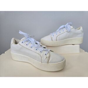 Give your summer fits some romantic edge with these Steve Madden platform sneakers featuring bold embroidered red roses and a clean white PU upper. Soft platform sole gives a subtle lift and comfy all-day wear. Women’s size 7.5 with lace-up closure. These babes have been loved—please note visible wear: cracked lining at the heel collar, stitching loose near the eyelets, and some scuffing on the midsole (see photos). Still tons of life left and major Y2K energy.