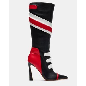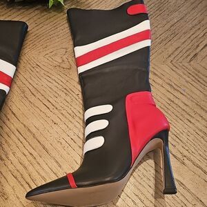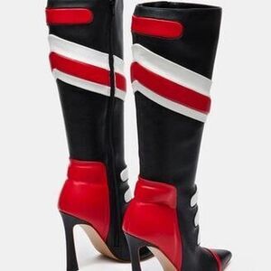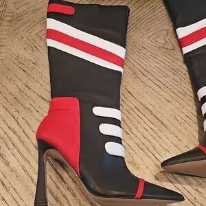 Step out in style with these chic black and red knee-high boots. Perfect for making a bold statement, these boots feature a sleek design and comfortable fit. Ideal for any fashion-forward wardrobe.