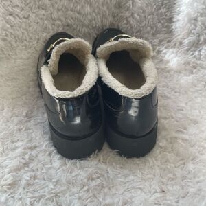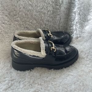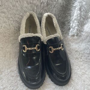 Steve Madden synthetic black Patent Chunky lug platforms loafers bit buckle accent SZ11M faux Fur lining.Pre owned in good used condition some scratch marks on the inner sides of the heels. See all pictures any questions please message