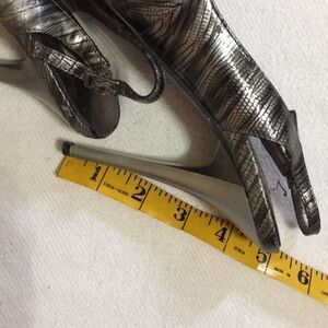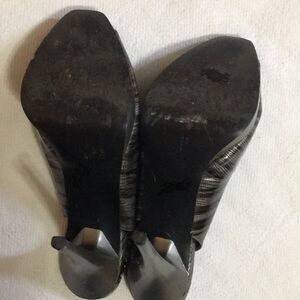 GUC, normal wear, no size printed on shoes, sticker when bought 6/6.5 see pics, grey/silver color, platform, stiletto heels, sling back adjustable ankle straps, very versatile color,