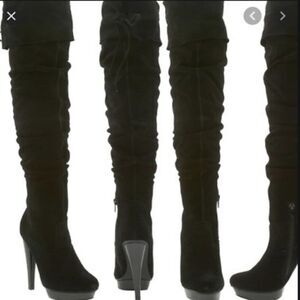 Be ready for winter in these over-the-knee suede boots. Wear them completely up or fold over a cuff. Platform 3/4 inch and 4 1/2 inch heel. In good condition. Little wear.