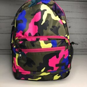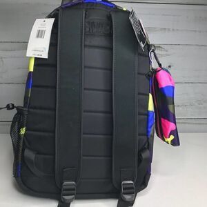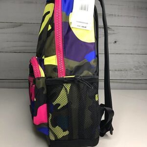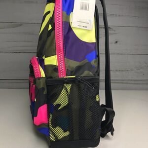 Pink exterior hardware, 2 zip pockets, adjustable water bottle pocket & 1 slip pocket with ID window