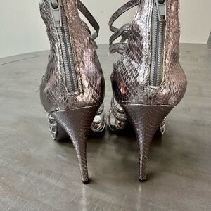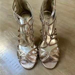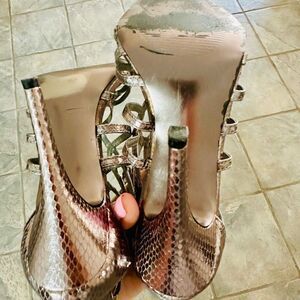 Step out in style in these stunning, strappy high heel sandals by Steve Madden in a metallic pewter color. Featuring a back zipper and 4” heels. Slight discolor on bottom soles. Overall great lightly used condition.