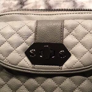 Grey shoulder strap with partial chain. Excellent preowned condition. Worn a few times.  Height Aprox 6.5 x 8 wide.