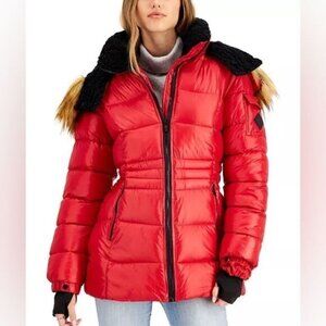Steve Madden Juniors' Faux-Fur-Trim Hooded Shine Puffer Coat Red XL New NWD