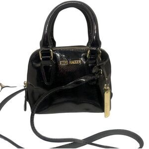 Patent leather mini crossbody, double handle, zip Foote, signature logo and signature fob, perfect for a night on the town for all your essentials