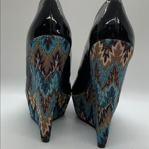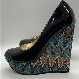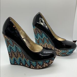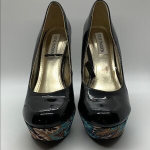 Steve Madden P-Elli platform black paten leather heels. Excellent used condition with no signs of wear on bottoms or platform. Paten leather has a few scuffs. Please view photo. All manmade materials
