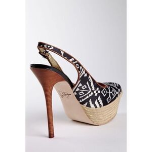 Sam Edelman • Navajo Slingback Novato Pumps Peeptoe Sling back 5” heel 1.5” platform Fabric upper Leather outsole Woven espadrille platform Size 9 See photos for signs of wear Black and white Navajo Aztec style print in good condition. See pics