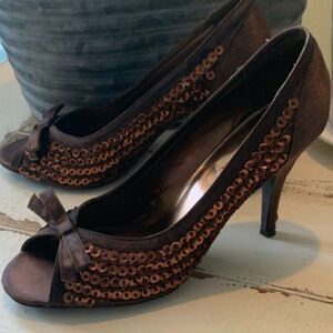 brown sequin and fabric peep toe with bow 4in. small blemish on left heel - can't see with color of fabric
