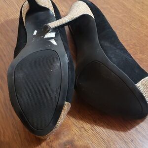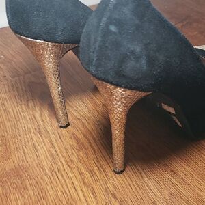 Steve Madden Black Suede and Gold Stiletto Heels. Black Suede with Gold Tipe and Heels. In very good condition. Make great Prom, New Years Shoes. Size 8.5. 4" Heels.