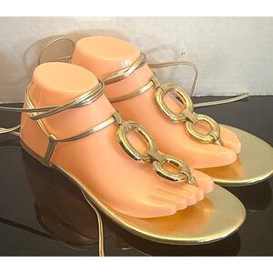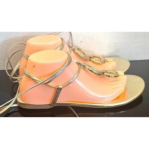 Women's Metallic Calculate Embellished Faux Leather Ankle Size 8.5. Elevate your style with these stunning gold sandals from Steve Madden, featuring a chic ankle wrap design. The criss-cross straps offer a secure fit, while the open design adds a touch of elegance to any outfit. Perfect for both casual and formal occasions, these sandals are a must-have addition to your wardrobe. Beautiful Preowned Condition!
