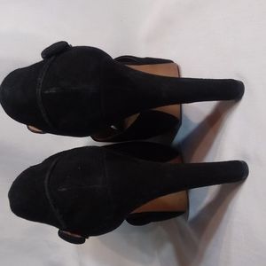 Beautiful Boss Lady Black Suede Simi Chunky Heel So Elegant w/ Open Toes ,Peekaboo Sides & Buckle Sides Perfect For Any Special Occasion Entertainers Delight In Perfect Condition.