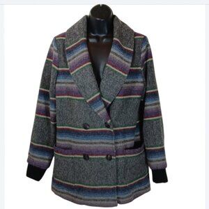 Steven Alan Woolrich blanket jacket features a beautiful Southwestern Indian-style blanket pattern in a mid thigh-length long blazer style. The jacket is made of a wool blend fabric and features a button closure and long sleeves with contrasting black cuffs for a more cozy effect (see detailed pic). The multicolor striped pattern is eye-catching and unique, perfect for adding a pop of color to any outfit . Beautifully lined.