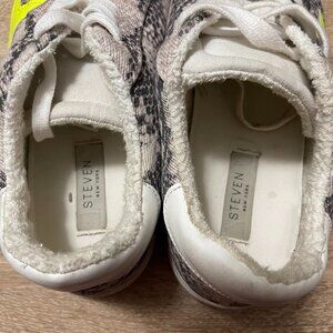 Steven By Steve Madden Women's Reeves Python Snake Neon Star Sneaker Size 8.5. Color white gray neon star snake print, Material fabric synthetic PU Faux Vegan suede toe. Some general discoloration to white, see photos. Offers always welcome!