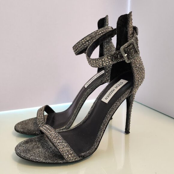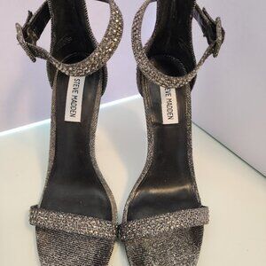 Steven Madden Silver Rhinestone Mischa Heels Size 8, ankle strap with adjustable buckle, open-toe, 4" heel, only visible wear is on soles and some fraying on back heels shown in video/pictures!