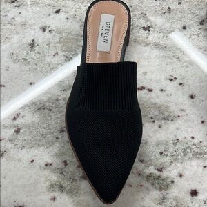 Steven New York Women's Valdez Knit Slip-On Mules in Black is a pair of stylish flats featuring a pointed toe shape and breathable knit fabric with a textured knit accent