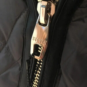 The highest end of the Steve Madden designs, Steven, brings us this futuristic grey-toned jacket with an on trend asymmetrical zipper. Gold toned accents for unstoppable style perfect for your winters at the ski resort. Faux fur- no animals harmed for removable hood.