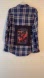 A classic plaid flannel shirt elevated with a unique twist - a Steven Rhodes design "Adopt a Familiar: Nlack Magic Animal Rescue." This long-sleeve button-down shirt features a traditional blue plaid pattern with shades of gray and white, providing a timeless aesthetic. The shirt is distinguished by the upcycled patch on the back, showcasing an assortment of mystical creatures in a vibrant red and black design. The patch is stitched on with excellent craftsmanship. With a chest pocket, classic collar, and buttoned cuffs, it combines comfort with an eye-catching and playful style. Ideal for casual outings, concerts, or adding a touch of personality to everyday wear. Great for spooky season Halloween. Fright fest.