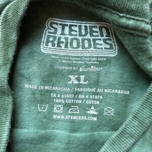 Details: Green tie-dye base, large colorful frog/skull/mushroom print, ribbed crewneck, short sleeves, straight hem, Steven Rhodes stitched hem tag.
