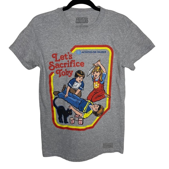 Steven Rhodes Let’s Sacrifice Toby Tee Size Small Used: good condition. Some cracking on image however still in great condition to wear. 90% Cotton 10% Polyester Grey Short sleeve *D17 Tags: let’s sacrifice Toby tee, funny tee shirts, Spencer’s tees, crude humor shirt, novelty shirt