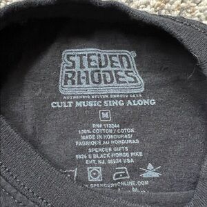 Steven Rhodes Tshirts-black ‘Cult Music Sing-Along’ is a medium, grey ‘Curses & Spells for Kids’ is a small. Both Tshirts. Selling as a bundle for both shirts