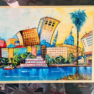 🎨 A striking signed print by artist Steven Schuman, titled “Savannah Skyline.” Beautifully double-matted with a slim 1/8" gold mat inside black matting, signed in gold by the artist on the mat. Not framed — ready to be placed in the frame of your choice.
