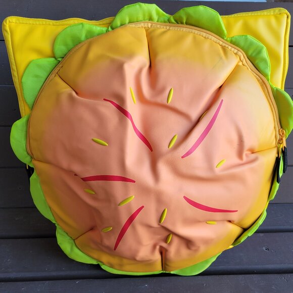 This Steven Universe Cheeseburger backpack is certainly a talking piece. It does have some scuffs on the front bun and therefore is being sold lower than intended. Pictures of scuffs are shown. Has three pockets: front bun which features an inside sleeve, cheese slice, and tomato slice.