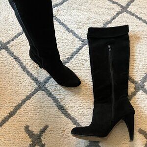 Lightly worn but lovingly maintained. Just a few small scuffs on the suede but barely noticeable. These knee-high boots with 3" heel are great for winter nights out when you want to stay warm but look sexy. Very flattering on the leg. Zip-up closure and folded detail at the top of the boot.