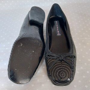 Steven by Steve Madden, black, sequin and white circular stitching, ballet flat with bow detail on toe. Ribbon stripe detail on heel. Excellent condition.