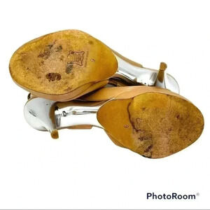 Brown/Tan Leather, peep toe, slingback leather heels with mirror heels.