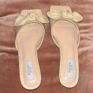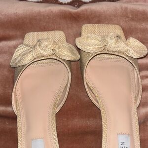 Chic gold heels with a woven texture. Adorned with a stylish bow. Perfect for special events.