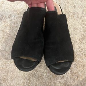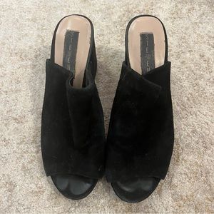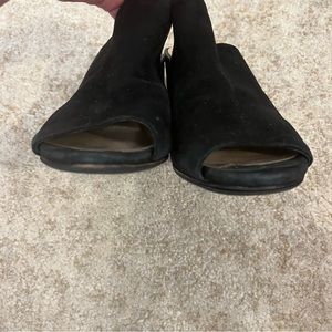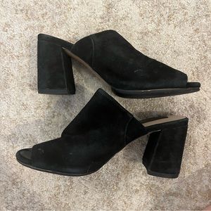Steven by Steve Madden Fume Mules. Color: Black. Size: 7. Round peep-toe slip-on mules with a block heel.
