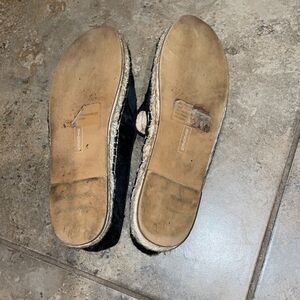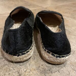 Espadrilles, slip-on, loafers with black calf hair uppers, twine outsoles and foot bed, leather lined insoles and rubber soles by Steve Madden in a size 8.5. The style is called Lanii. Uppers in great shape. Signs of use on soles and some spots on the outsoles. Overall in good pre-owned condition with signs of wear from normal use
