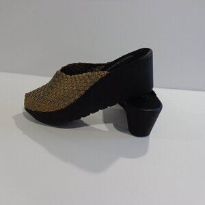 The wedge heel type and rubber outsole provide stability, while the vegan upper material and weave pattern contribute to the unique look.