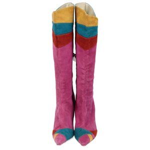 Amazing suede boots! Knee high. Pink, teal, yellow, red-orange coloring. Wooden heel, which is about 4" in height. Side zipper. Vintage retro 1960's vibes. Size 7.5.