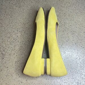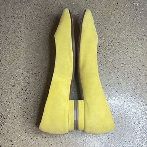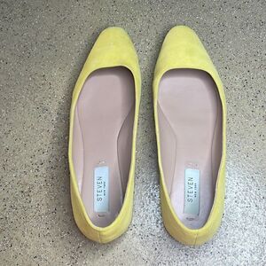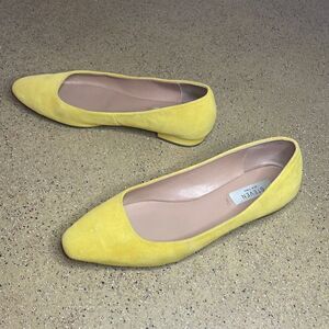 Steven New York Bantry Yellow Suede Flats sz 8. Features happy sunshine yellow genuine suede uppers, suede wrapped low curved heels, lightly padded footbed liners, rounded almond shaped toes. Worn a few times with light overall signs of wear including scuffs/marks/dust marks/break-in/wrinkling of the suede uppers, wear/light peeling to toe box area of footbed liners, wear to bottoms and heels/heel caps (see pics). Are you looking for a fun colored shoe to add pop to your wardrobe? Look no further!!