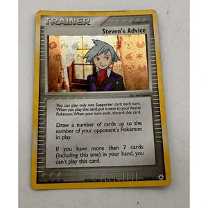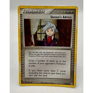 This rare Steven's Advice card from the 2004 EX Hidden Legends set is a must-have for any serious Pokémon TCG collector. With its vintage design and reverse holo finish, it's sure to be a standout addition to your collection. The card features the iconic Steven's Advice character and is an uncommon trainer card, making it a valuable addition to any deck.