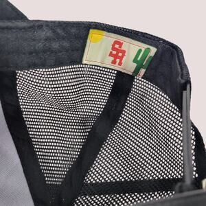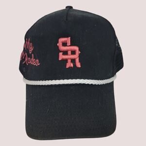 Stevenson Ranch classic trucker hat FEATURES 'not my first rodeo' in script embroidery on the side. Canvas front panel with embroidered SR logo. Mesh back panel. Slightly curved brim. Adjustable plastic snap closure in back.