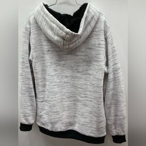 Stylish white hoodie with black accents. Features a zip-up front and drawstring hood.